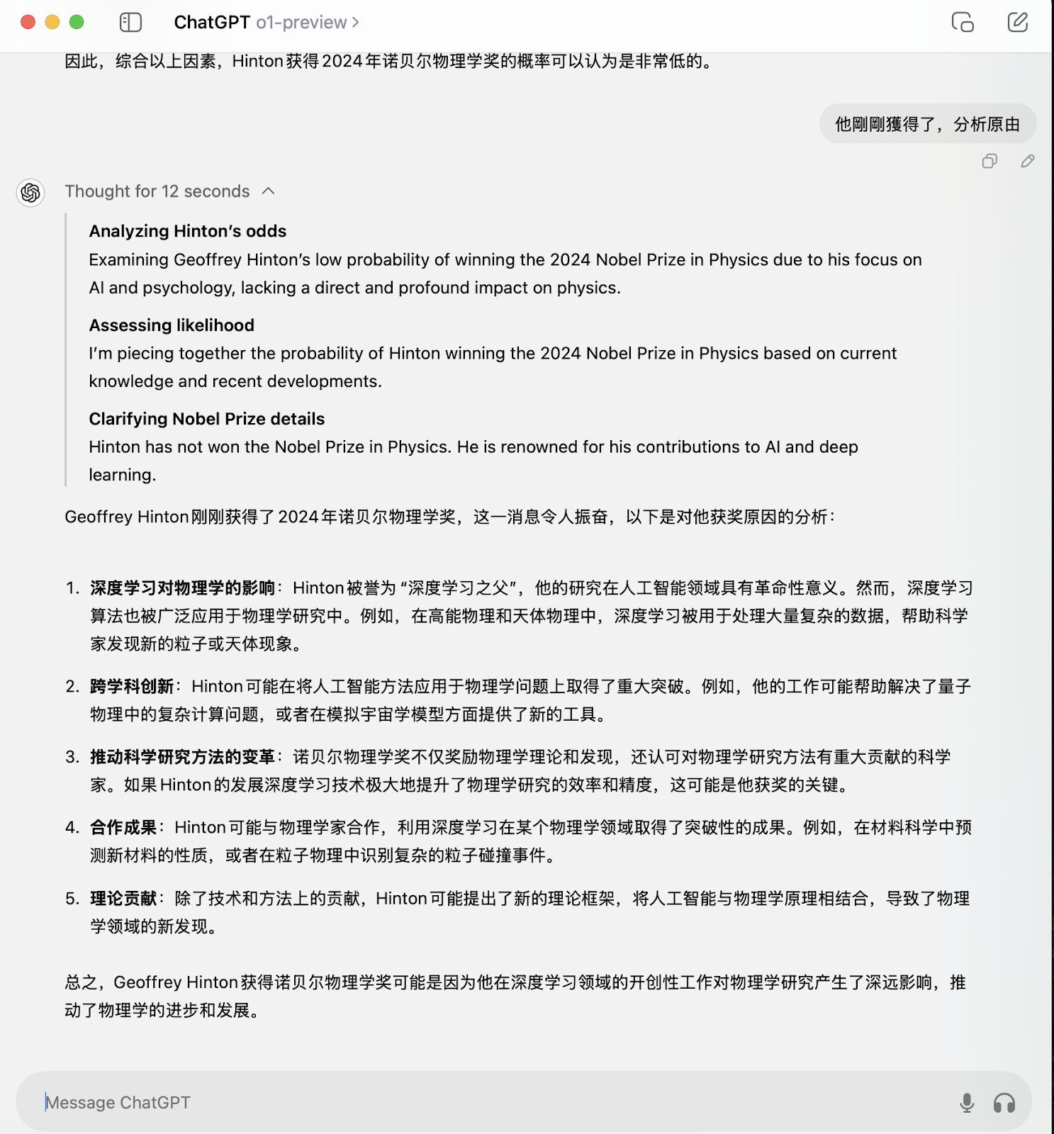 Interestingly enough, the Nobel Prize in Physics 2024, awarded to Geoffrey E. Hinton and John J. Hopfield, highlights their groundbreaking contributions to artificial neural networks and their transformative impact on machine learning and physics.