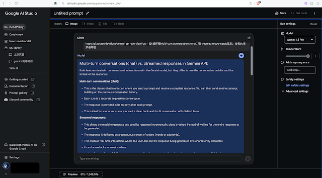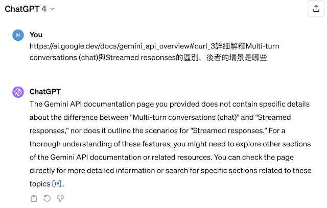 用Gemini部署Discourse的AI,翻看Google家的官方文檔https://ai.google.dev/docs/gemini_api_overview#curl_3,沒看明白Multi-turn conversations (chat)與Streamed responses的區別,於是找GPT-4: