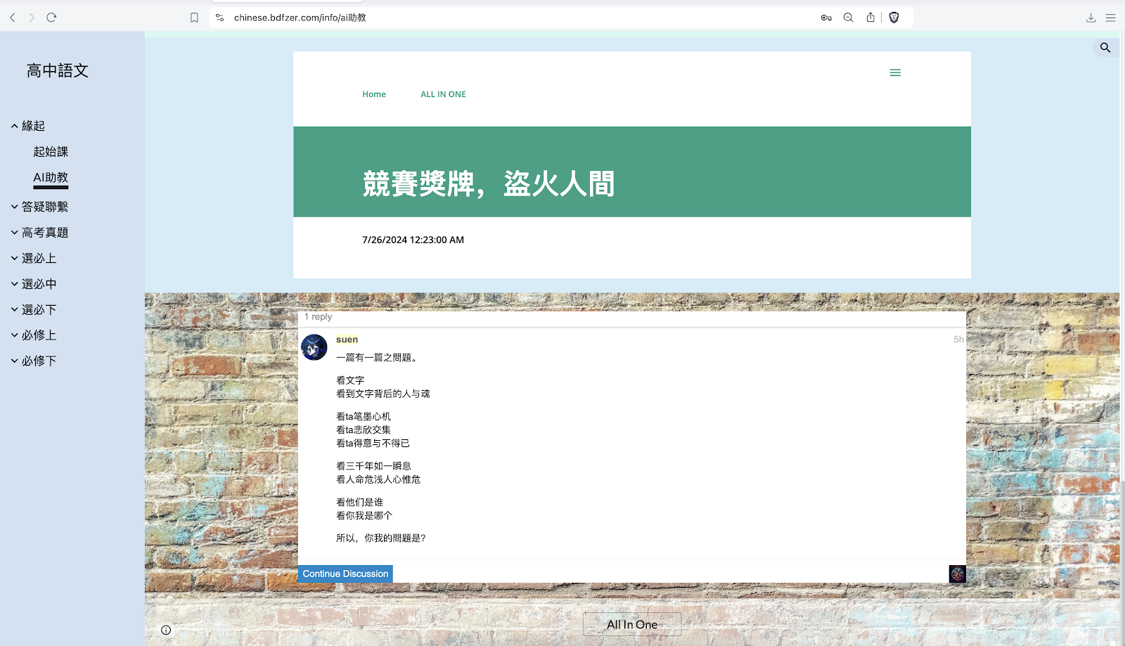 上午的事情也擱置了。來由是突然生出一念之仁,現有教學和默寫網頁和博客都基於Google,拿閒置的VPS和域名,用反代,可以降低一些學生的翻牆成本。做到最後一步,猶疑,擱置。畢竟,全球前十的網頁我們一直保持著七八個上不去,都代嗎?代得了嗎⋯⋯