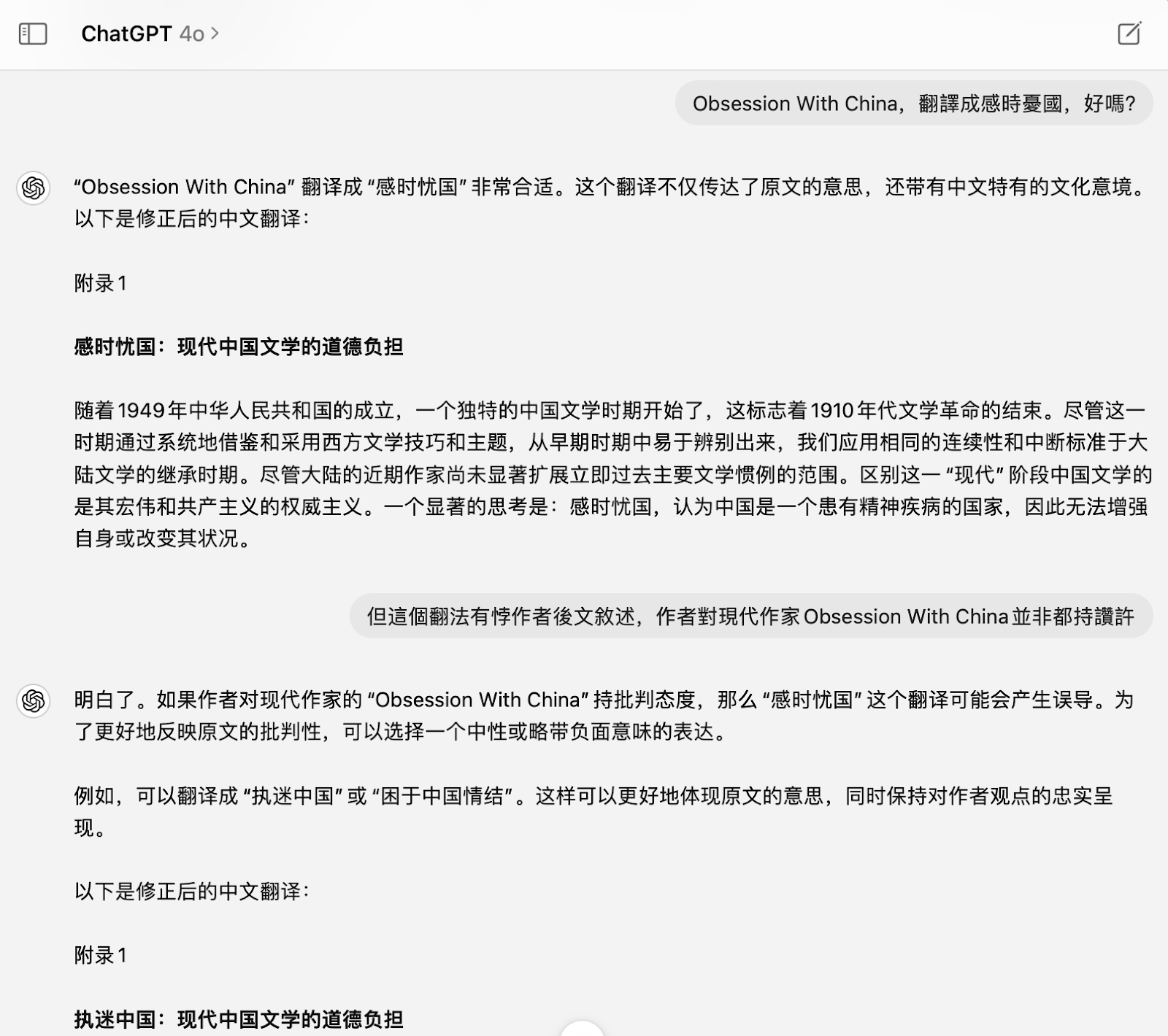 要讀懂這題目就需要結合上述與GPT-4o的對話,Obsession With China: The Moral Burden of Modern Chinese Literature譯作感時憂國,基於1971年附錄原文,無疑是有很大偏差的。 紐時訃告 中文版《夏志清超越的,是中国的边界》內段落,正可以做教材很好的參照: