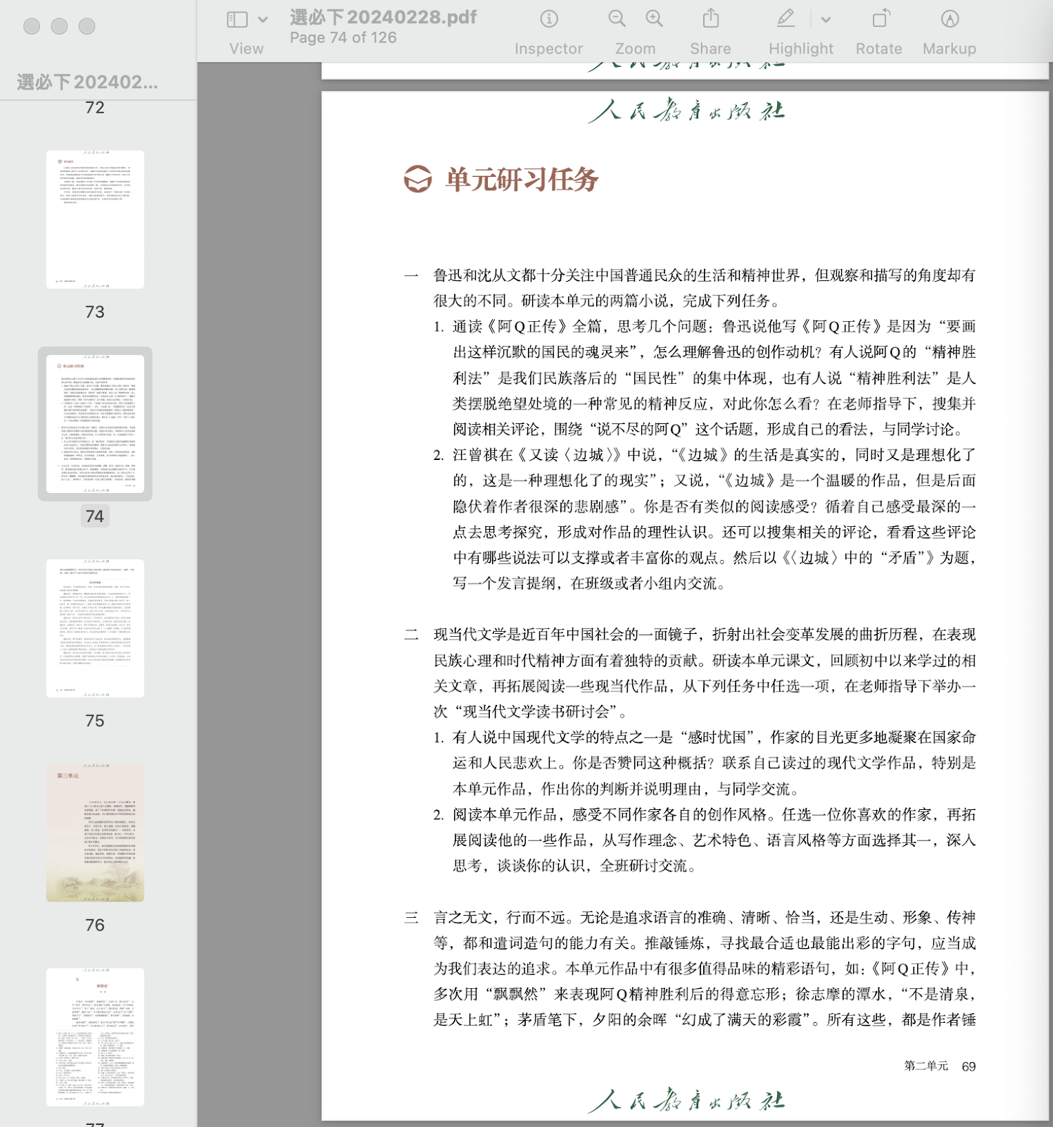 去年這節時和學生淺翻過全書,今日又涉,重新翻過,再標黃標註些。個人對評論向來不感冒,有閒暇自當品原著,但既教材牽扯,且高考整本書有關魯迅沈從文,姑摘擇相關,且共讀賞: