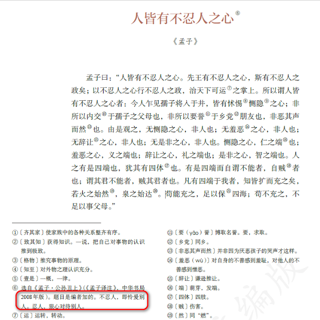 不忍人即憐愛別人這句,實在該刪除。道理很簡單,對忍人做否定,在邏輯上,很明顯並不意味著憐愛別人。