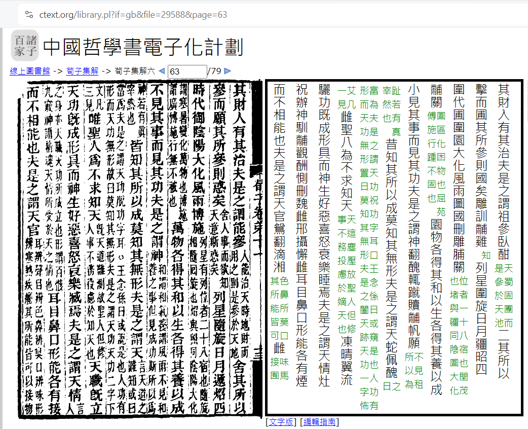 “夫是之谓能参"一句下,有"人能治天時地財而用之則是參於天地”,這個解釋看完,”參“字,就落地了,參天參地吧。這裡其實有三種可能:一是有註釋且能看明白,問題解決;二是有註釋但看不明白,問題存疑;三是無註釋所以繼續不明白。針對二,以本書為例,如果清代集解都沒有,基本就可以說沒有更權威資料了。有清人注疏,幫我們梳理了前代所有但我們依舊看不明白,高情商來看,這可以成為你日後的陣地;低情商看,你需要和第三種情況合併做別的事情,這個在下文。在學術史上,清人注疏之無敵就在於考鏡了源流,一般而言,重難點是都解說了的。如果不是本書,如果電子圖書館內給的不是清代集解,此處確實有進一步尋找清代集成式著作的空間,這個涉及古文獻的很多知識,姑且打住。針對三,沒有前人注疏,是個好消息,也是壞消息。好消息就是給了我們去注疏的可能性。但走到這裡,就已經不是先查前代注疏的問題而是我們要嘗試做注疏了,所以,也在下文專門討論。還記得以上只是兩種方式之一嗎?你當然忘了。這裡有兩個方式:其二,將你多不明白的字句,直接在校內登錄duxiu,根據結果,稍作閱讀,自然也就知道答案了。之所以可以這麼做,是因為duxiu本身有專業數據庫的質量保障。查完前人注疏正義集解,甚至一併duxiu過。懂了可以繼續深究,不懂,就需要找我討論了。活老師的價值,其實也就這麼一點了。先查前代注疏。後呢?無論有注疏而不接受或根本沒注疏,歸根結底,古文無非字詞句篇章節,在現代技術加持下,高中生已經有可能註釋任意一本古書了,只要,找到方法。課堂教大家用漢典,其實是一個化繁為簡的教法。引入漢典,其實真正看重的,還是其中徵引了說文解字。所以,這就引入我們課程後期的基本架構了: