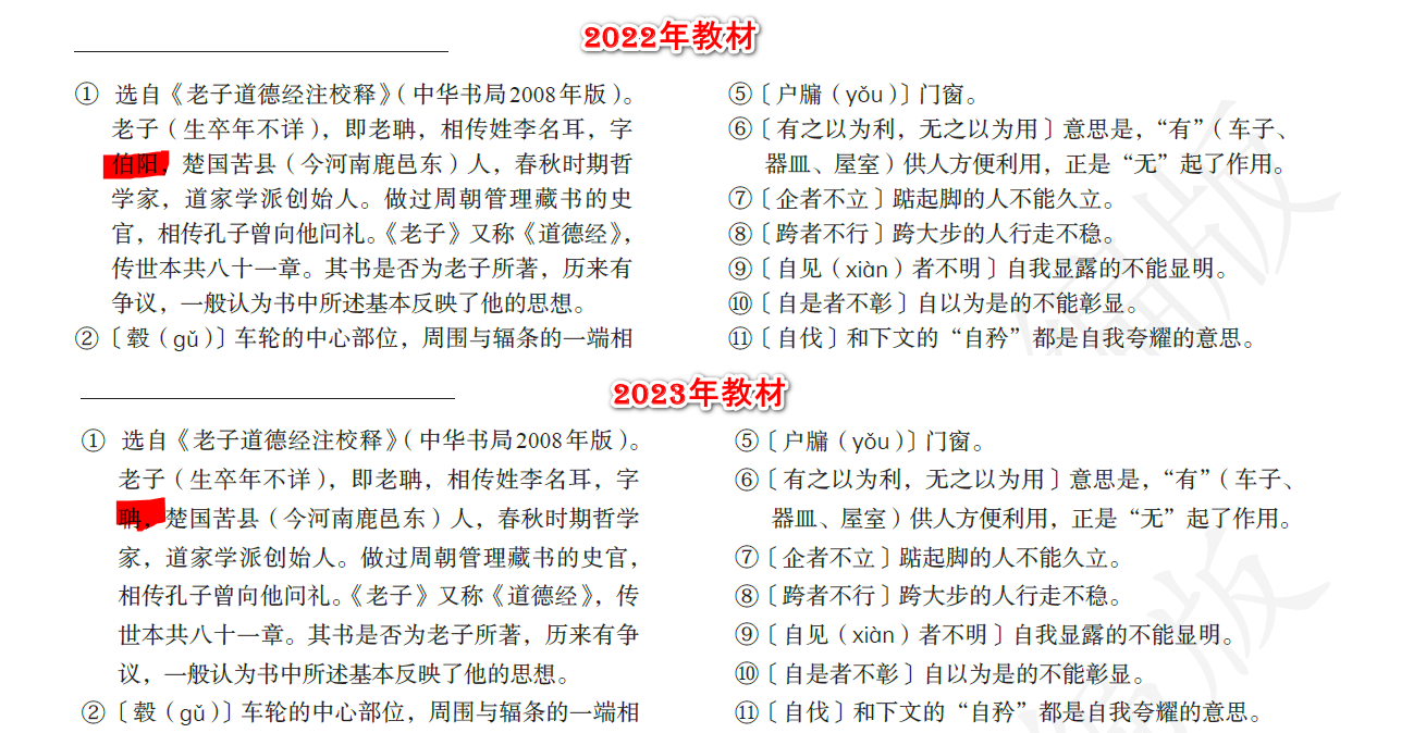 但2022年教材:老子(生卒年不详),即老聃,相传姓李名耳,字伯陽。