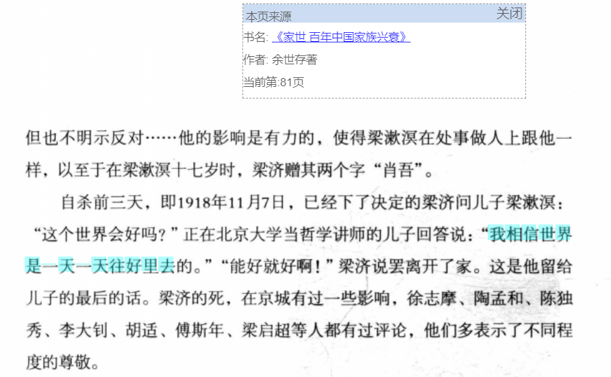 1918年11月7日,已经下了决定的梁济问儿子梁漱溟:“这个世界会好吗?”正在北京大学当哲学讲师的儿子回答说:“我相信世界是一天一天往好里去的。”“能好就好啊!”