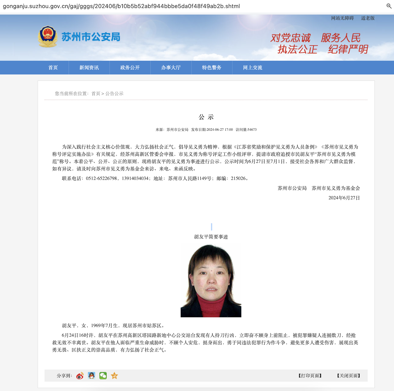 胡友平简要事迹胡友平,女,1969年7月生,现居苏州市姑苏区。6月24日16时许,胡友平在苏州高新区塔园路新地中心公交站台发现有人持刀行凶,立即奋不顾身上前阻止,被犯罪嫌疑人连捅数刀,经抢救无效不幸离世。胡友平在他人面临严重生命威胁时,不顾个人安危,挺身而出,勇于同违法犯罪行为作斗争,避免更多人遭受伤害,展现出英勇无畏、匡扶正义的崇高品质,有力弘扬了社会正气。 https://gonganju.suzhou.gov.cn/gaj/gggs/202406/b10b5b52abf944bbbe5da0f48f49ab2b.shtml 因為作者的用心著實可怖。這段要細讀詳析。站台信息無比詳細,目的卻是在掩蓋真實的地點:日本人學校和一校車未成年日本學生。有人持刀行兇之說,輕輕描又淡淡寫,藏藏掖掖,閃閃爍爍,遮遮掩掩。如果文字一直被褻瀆,新聞與事實,無疑是一直被強姦!一個全球都看得到的事件,如此拙劣掩飾,還偶發偶發又偶發,我黨的最後一絲遮羞布,也算扯下來了。他人面臨嚴重生命威脅的“他人”,很神。避開了日本人的國籍,更完全不提未成年的學生身分,這心思,有一點點用來做實事,都可以強國富民;可偏偏,都用來與文明為敵做帝制美夢。這兩年被遮蓋的類似事件何止一二⋯⋯這民族,這傳統,在這個意義上,半點不值得。