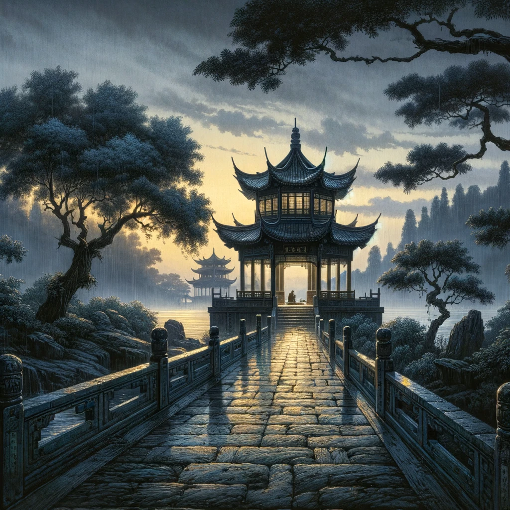 以上是诗词赏析的基本思路,我们今天就以柳永《雨霖铃》一词为例,依据上述五个层面,以词法为重点,加以分析,希望同学们能从我们的分析中有所获得,以便在进一步阅读古典诗词、或者在面对他人赏析与试卷中的题目时,不至于浮泛飘忽或者无所适从。我们首先来看一下柳永的这首词作。雨霖鈴寒蝉凄切,对长亭晚,聚雨初歇。都门帐饮无绪,留恋处,兰舟催发。执手相看泪眼,竟无语凝噎。念去去,千里烟波,暮霭沉沉楚天阔。 多情自古伤离别,更那堪、冷落清秋节!今宵酒醒何处?杨柳岸,晓风残月。此去经年,应是良辰好景虚设。便纵有千种风情,更与何人说?赏析词的正文之前,首先我们要了解一个词学尝试,这也是词法中极其重要的部分,这就是词牌本义,每一个词牌背后都有着或隐或显的背景抑或故事,词人选取一个词牌抒怀也往往会与之关联。《雨霖铃》词牌,正是如此。《雨霖鈴》,亦名《雨淋铃》。据清代毛先舒《填词名解》,词牌当来自唐玄宗避安禄山之乱。毛先舒采前人说,称:“雨淋铃,玄宗幸蜀道,出剑州梓潼县,霖雨弥日,栈道中闻铃声,帝方悼念贵妃,采其声为雨霖铃曲以寄恨。时梨园弟子张野狐善篳篥,因吹之,遂传于世。又有双调雨淋铃慢,颇极哀怨,是其本曲遗声也。从本段记载中可知,雨霖铃的名字,自其诞生即属“寄恨”之篇、为“哀怨”之曲。而柳永,又变之为新声,为我们写下了一场迷离至极凄婉至极的的爱别离。那么,跟着词人的笔墨,就让我们尝试还原这凄美文字背后的那场别离……雨霖鈴寒蝉凄切,对长亭晚,聚雨初歇。都门帐饮无绪,留恋处,兰舟催发。执手相看泪眼,竟无语凝噎。念去去,千里烟波,暮霭沉沉楚天阔。 多情自古伤离别,更那堪、冷落清秋节!今宵酒醒何处?杨柳岸,晓风残月。此去经年,应是良辰好景虚设。便纵有千种风情,更与何人说?“寒蝉凄切”写当前景物,点明节令,与下片“清秋节”呼应,不但写所闻、所见,并写出所感,可称融情入景。所谓点明节令,在于“寒蝉”一词,传统文化背景中,有“孟秋之月……凉风至,白露降,寒蝉鸣”的基本常识。而更值得关注的是,“寒蝉”两字韵母相同,成为叠韵词,“凄切”两字声母相同,构成双声;这更使得词作开篇即生出婉曲之致。黯然销魂者,唯有别离,而别离心思的柔肠婉曲,正借助了双声叠韵的婉曲在一瞬间弥散在我们身边。“对长亭晚”一句暗寓别情。“长亭”、“短亭”是古诗文中常见的两个词,传说为李白所作的《菩萨蛮》词有“何处是归程?长亭更短亭”,而“长亭外古道边”的《送别》之曲也是脍炙人口。从现存文献材料来看,这两个词最早出现于南北朝时代庾信的《哀江南赋》:“十里五里,长亭短亭。”《辞源》解说两词是:“长亭:秦汉十里置亭,亦谓之长亭,为行人休憩及饯别之处。”“短亭:旧时于城外五里处设短亭,十里处设长亭,以为行人休止之所。”由此可知,柳永“长亭”一词,已含别离之事。“晚”字进一步点明时间,并且也为下面的“兰舟催发”铺垫。在“对长亭晚”一句中,“寒蝉凄切”所弥散的黯然似乎更多了一种顿挫吞咽,这种顿挫,首要来自于“对……长亭……晚”的一二一结构,孟秋暮色之中,别离的氛围已经溢满心胸,这场悲莫悲兮的千古恨别也就此完美地揭开帷幕。“骤雨”是“留恋”之由,“初歇”则是“催发”之由。本来该走了,忽然一阵急雨,于是因雨留恋,但天色向晚,雨也停歇了,拖延的别离终究还是要继续上演。由“都门”二字可知此词作于汴京,“帐饮”是离别的筵席,读词者或者预期作者会就此铺叙一场,但转目即发现,作者竟以“无绪”二字飘然略过,因为满腹别恨离愁,故此饮也不畅,食也无味,心绪之寥落可见一斑。这也暗示出留恋之情深,别离之味苦。紧接帐饮是一笔实写,驾船的,“催发”;乘船的,“留恋”。“留恋”,则不忍别;“催发”,则不得不别。此时此刻,别情恰似东流之水,绵长无际,辗转难绝。留恋处,一作方留恋处。版本不一,如见到不一者知道原因即可。“执手”两句,并无特异之词,但就是这平俗之语,却将千古以来话别之境完美诠释,其深挚细腻、妙到毫颠。不得不说,柳永之词作或有失之于俗,却也胜之于真。苏轼〔江城子〕(乙卯正月二十日夜记梦》)所云:“相顾无言,惟有泪千行。”与此同意,不过一个是生离场,一个是死别梦而已。作为领字,“念去去”的“念”字上承凝噎,“去去”两字迭出,一字一顿,更显天涯孤旅,凄然前行,前路的茫茫修远与此刻眼前所见的“暮霭沉沉”,并“烟波”的实景,虚实相合,余韵不绝。读词至此,如何不使人身入离别境界,无可自拔……上阙中正面话别已经曲尽,于是下阙首句即推开一层,泛说离愁别恨自古皆然。但接此,第二句又立刻翻进,极言清秋之日作别尤为可悲。这翻进的一句,一则暗暗和鸣于文士悲秋传统,一则也遥接上片“寒蝉”的起句。这种翻进之法在柳永《乐章集》中并非孤立,如昼夜乐》一词中“何期小会幽欢,变作离情别绪,况值阑珊春色暮,对满目乱花狂絮”,与此比照,一春一秋,悲苦则并无不同。“今宵”两句,是全篇精粹,课本中征引东坡“我词何如柳七”知名典故,也正是引此句作为柳词范本。“酒醒”一词,遥接上片“帐饮”,也可见帐饮别筵,虽然“无绪”,但酒入愁肠,终究有醉意朦胧。设问后自答,虚景而做实写。扁舟夜发,明朝醒后,想必已是拂晓,而所