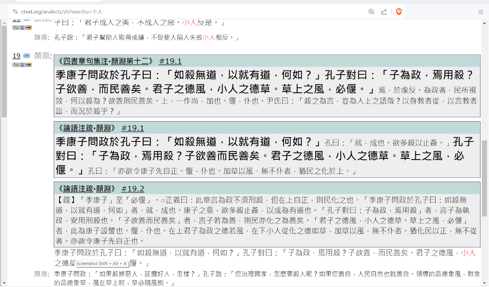 這個點,終究還是有人能看到:) https://ctext.org/analects/zh?searchu=%E5%B0%8F%E4%BA%BA