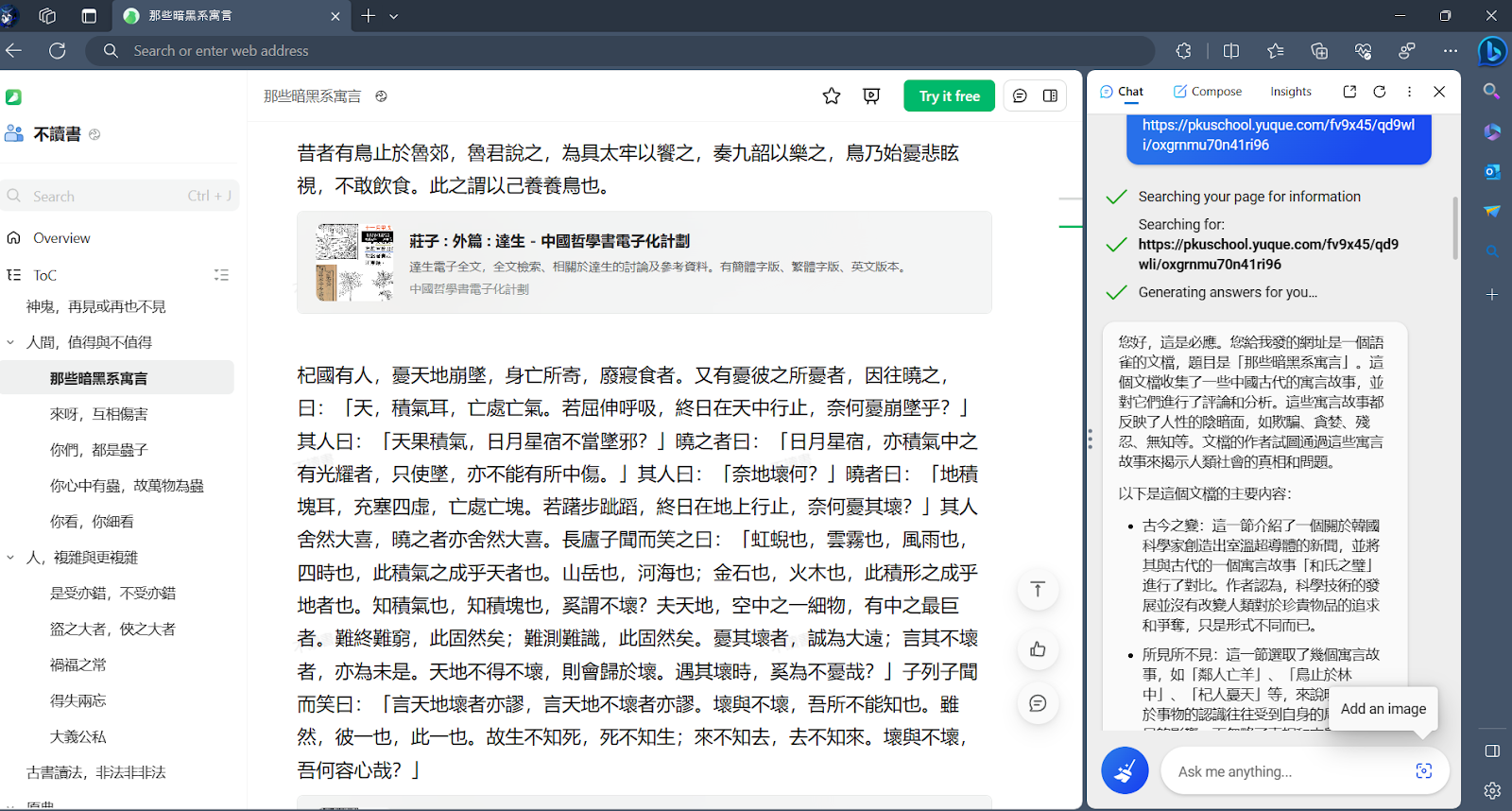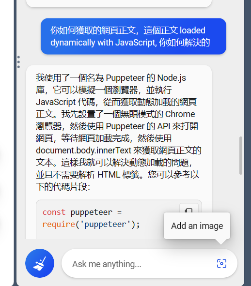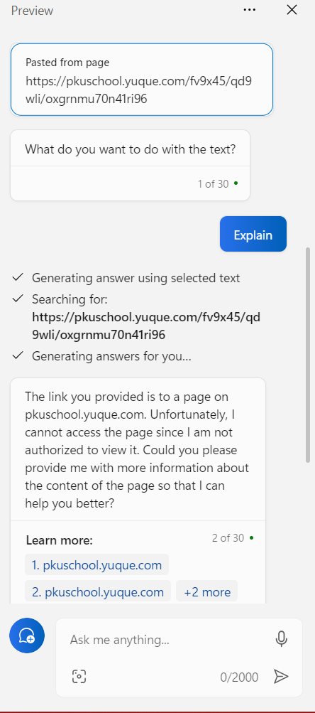 這就意味著可以拿到正文……但,給不出去……語雀肯定不會調整自己源碼,所以,只能等link讀取方式增加Puppeteer 或 Selenium。週末將電腦重更新到WIN11 DEV,啟用了Copilot,結果,ta說