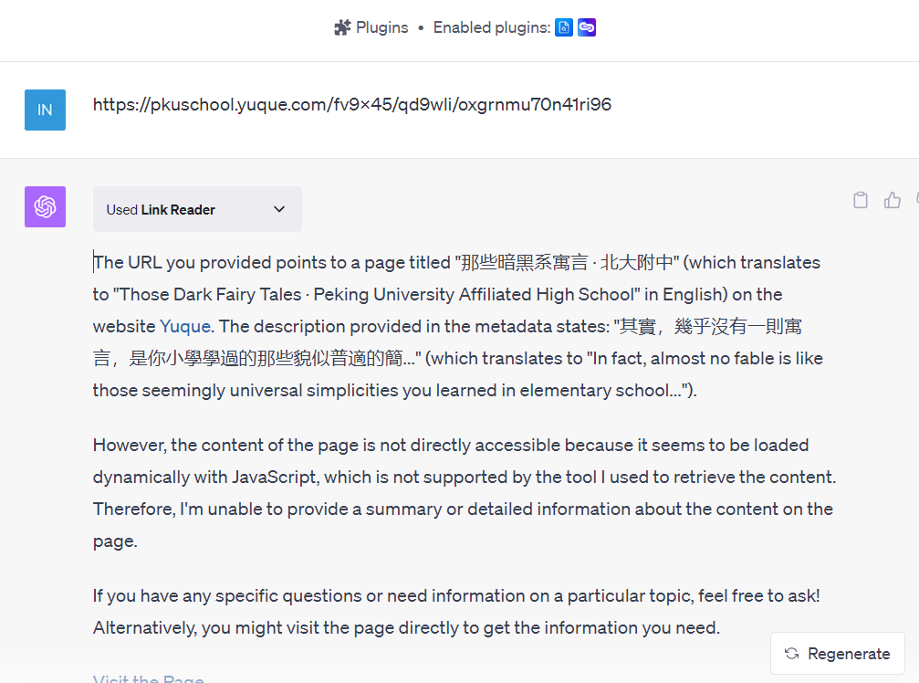 準備先秦課,順手將課程資料餵給GPT-4,看ta如何總結頁面內容,結果,無論是內置的bing瀏覽,還是可用link類插件,都直接: