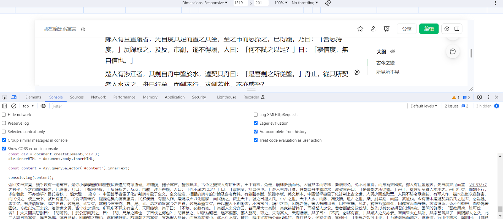 在console中运行const div = document.createElement(‘div’);div.innerHTML = document.body.innerHTML;const content = div.querySelector(’#content’).innerText;console.log(content);