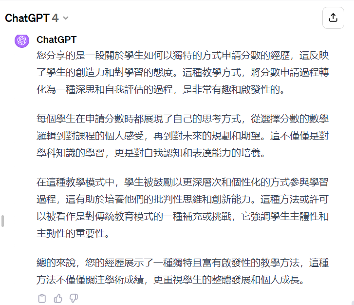 我想要95 A+,因为没有俗人会拒绝免费的午餐。但是我很心虚,Chat也劝我冷静,它告诉我要按照实际表现并尊重老师的决定。我觉得它好像什么都说了又什么都没说。但我毕竟是将中国人的劣根性展现的淋漓尽致的旧青年(……老师原话略加改编,对不起……老师🧎我没有丝毫的不敬)。故而我坦然把持着从众心理(看到大家都要了高分)和奴性(遵从老师您的决定)来申请这一分数🌹望您批准