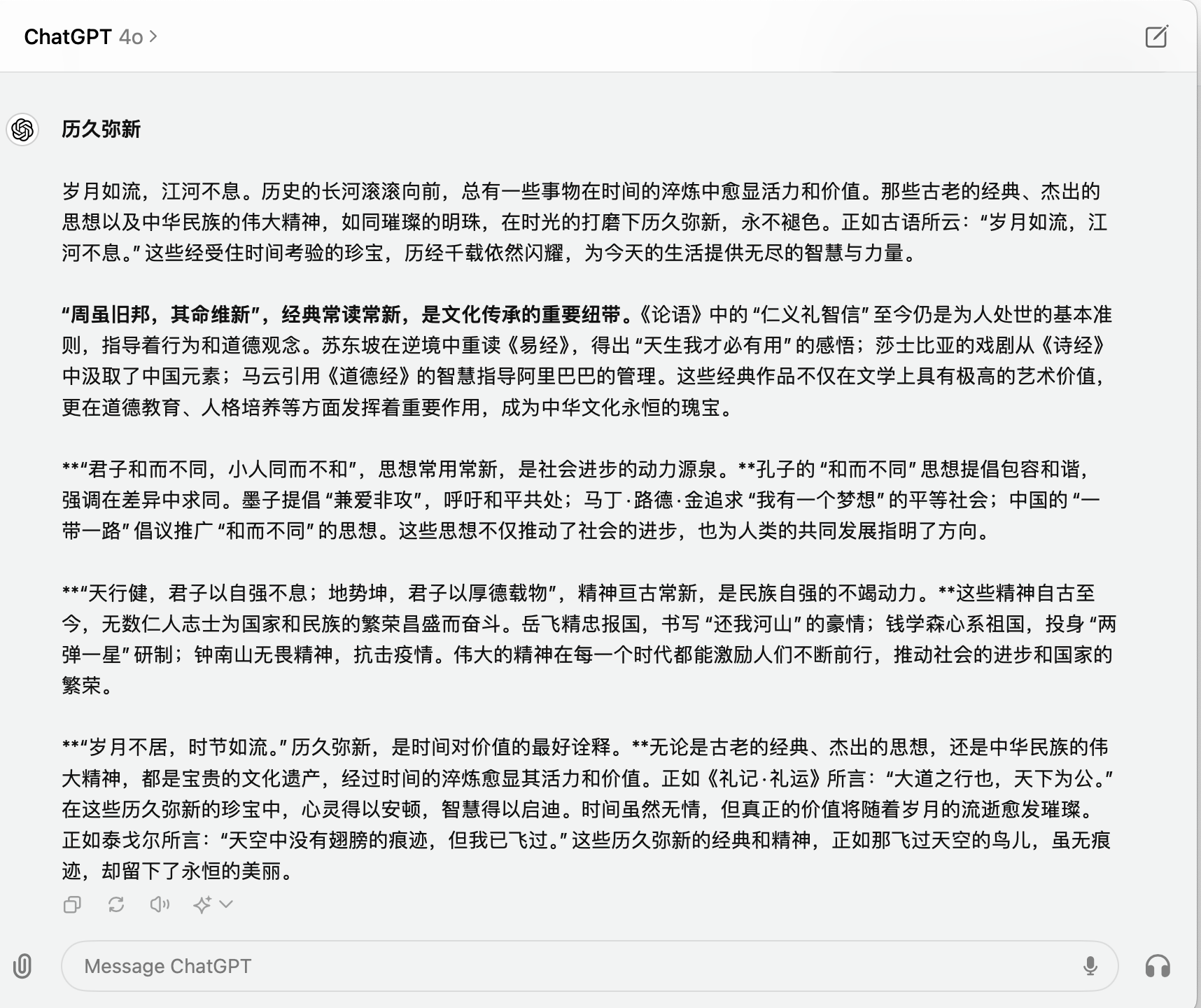 历久弥新,岁月如流,江河不息。历史的长河滚滚向前,总有一些事物在时间的淬炼中愈显活力和价值。那些古老的经典、杰出的思想以及中华民族的伟大精神,如同璀璨的明珠,在时光的打磨下历久弥新,永不褪色。正如古语所云:“岁月如流,江河不息。”这些经受住时间考验的珍宝,历经千载依然闪耀,为今天的生活提供无尽的智慧与力量。“周虽旧邦,其命维新”,经典常读常新,是文化传承的重要纽带。《论语》中的“仁义礼智信”至今仍是为人处世的基本准则,指导着行为和道德观念。苏东坡在逆境中重读《易经》,得出“天生我才必有用”的感悟;莎士比亚的戏剧从《诗经》中汲取了中国元素;马云引用《道德经》的智慧指导阿里巴巴的管理。这些经典作品不仅在文学上具有极高的艺术价值,更在道德教育、人格培养等方面发挥着重要作用,成为中华文化永恒的瑰宝。**“君子和而不同,小人同而不和”,思想常用常新,是社会进步的动力源泉。孔子的“和而不同”思想提倡包容和谐,强调在差异中求同。墨子提倡“兼爱非攻”,呼吁和平共处;马丁·路德·金追求“我有一个梦想”的平等社会;中国的“一带一路”倡议推广“和而不同”的思想。这些思想不仅推动了社会的进步,也为人类的共同发展指明了方向。“天行健,君子以自强不息;地势坤,君子以厚德载物”,精神亘古常新,是民族自强的不竭动力。这些精神自古至今,无数仁人志士为国家和民族的繁荣昌盛而奋斗。岳飞精忠报国,书写“还我河山”的豪情;钱学森心系祖国,投身“两弹一星”研制;钟南山无畏精神,抗击疫情。伟大的精神在每一个时代都能激励人们不断前行,推动社会的进步和国家的繁荣。“岁月不居,时节如流。”历久弥新,是时间对价值的最好诠释。**无论是古老的经典、杰出的思想,还是中华民族的伟大精神,都是宝贵的文化遗产,经过时间的淬炼愈显其活力和价值。正如《礼记·礼运》所言:“大道之行也,天下为公。”在这些历久弥新的珍宝中,心灵得以安顿,智慧得以启迪。时间虽然无情,但真正的价值将随着岁月的流逝愈发璀璨。正如泰戈尔所言:“天空中没有翅膀的痕迹,但我已飞过。”这些历久弥新的经典和精神,正如那飞过天空的鸟儿,虽无痕迹,却留下了永恒的美丽。]( https://chatgpt.com/share/ec7a90fe-f960-44bb-ac3d-7531fa54267f )