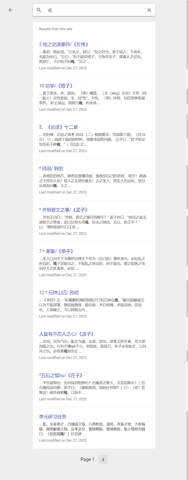 五本書,焉字全部用例有4頁,網站作為基本的人腦外接硬盤功能,完成。其實在AI時代,這種檢索,意義,越來越小了。嵌入了北京高考真題,所學即所考作為教育常識,顯然,在真實的北京高考命題時被完全無視,證據是網站上早就發布過的統計結果:北京语文高考2023年文言文内,黩货之风日甚一日 黩:贪求这里的“黩”字,现行初高中教材,一次未见。北京语文高考2022年文言文内,B.所上者告讦也 讦:揭发这里的“讦”字,现行初高中教材,一次未见。北京语文高考2020年文言文内,智伯不悛 悛:悔改这里的“悛”字,现行初高中教材,一次未见。這個可以直接說明一個問題,無論是教材編者,還是高考命題者,無非兩個草台班子……在大局如此前提下,讓更多學生最大獲益功利分數,並在功利之外,有所得,就是根本。所以,原則之二,是將高考題目嵌入日常以明確標準或底線,知道自己在各個領域最終會被什麼樣的題目考到,是目的。所以,課本節選的中國詩歌的意境,會給全文,詩詞鑑賞多年題目內,意象意境都是標答關鍵詞,沒有這篇全文,意象,是學不到位的。原則之三,是盡可能通過G-Drive嵌入更多原典原文,這個除去要解決課文刪減的硬傷,更多是要解決有餘力者本該更多進入真實閱讀天地。沒錯,教材這種東西,原本設計來就不是真讀書,而是所謂訓練讀書,且不說這個設計思路背後教育為生活的搞笑理念,即便是這個訓練,也是全無章法,亂七八糟的。這個也直接導致各個學校以此教研的尷尬,沒錯,本年度的屎上雕花熱詞,在教材,什麼海淀區教研組內備課各個環節,都蠻適用的。這篇文字是寫給自己做梳理與備忘,也會同步給學生說明用法;所以,原則之三的落實上,就需要學生自己解決一個問題,你需要能自己看到這些資料,雖然偶爾也會扔到課程企微,但系統提供都在網頁。沒錯,我是在逼迫你實現你的新校訓:國際視野。此前其實說過,這個境況來自CF反代技術的偶然,當初發現可以代理文字時,確實考慮過將文字之外內容放置到無牆的空間,但為逼迫國際視野,放棄了這個搭建思路。劣勢其實也很明顯,我必須放棄更多可能的互動插件,但前者更重要吧。這個時代,沒有這個視野,你就只能成為一個新文革的紅衛兵,去高喊:“在中国,在今天,再无‘圣诞节’!只有‘长津湖’”。當有人出來高喊文革是絕對不能翻案的這個口號時,你學過的道德經是否已經告訴你,文革時代的回歸大體是不遠了。沒錯,大勢所趨;但,我依舊希冀,有更多的你,在此後,可以讓時代的悲劇,晚一點,再晚一點。文字不能拯救性命,但也許可以說明,乃至喚醒些什麼吧。
