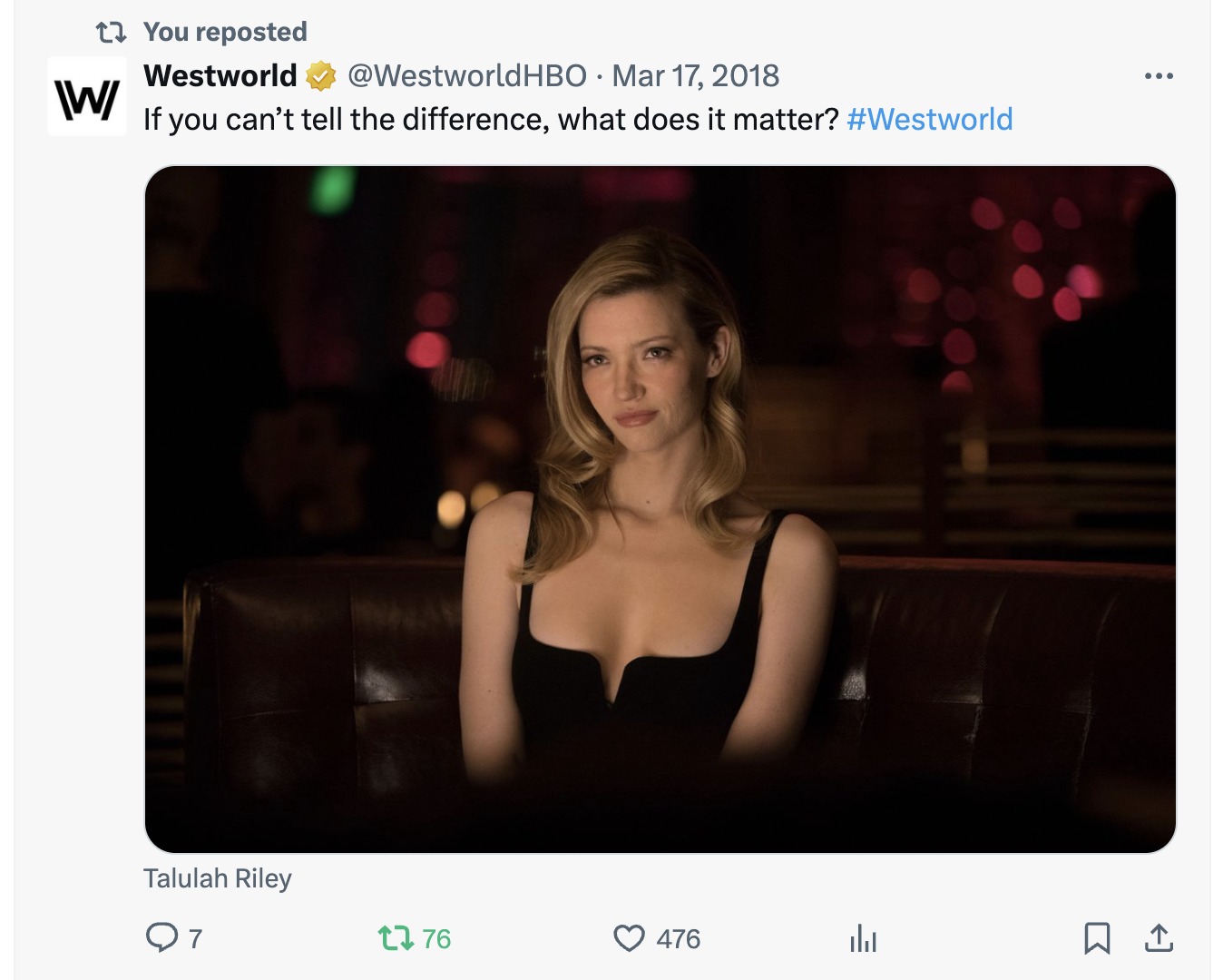 Lex Fridman (00:55:06) What do you think Alan Turing would say, without understanding anything, just hanging out with it?Yann LeCun (00:55:11) Alan Turing would decide that a Turing test is a really bad test, okay? This is what the AI community has decided many years ago that the Turing test was a really bad test of intelligence.這,就很好玩。祭出多年前美劇經典言論: